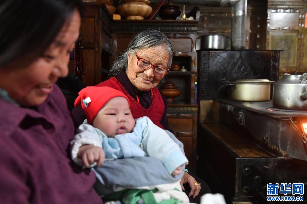 在林芝市米林縣吞北村的家中,布魯老人(右)慈祥地看著小孫子久美多丹(3月28日攝)。新華社記者 孫瑞博 攝