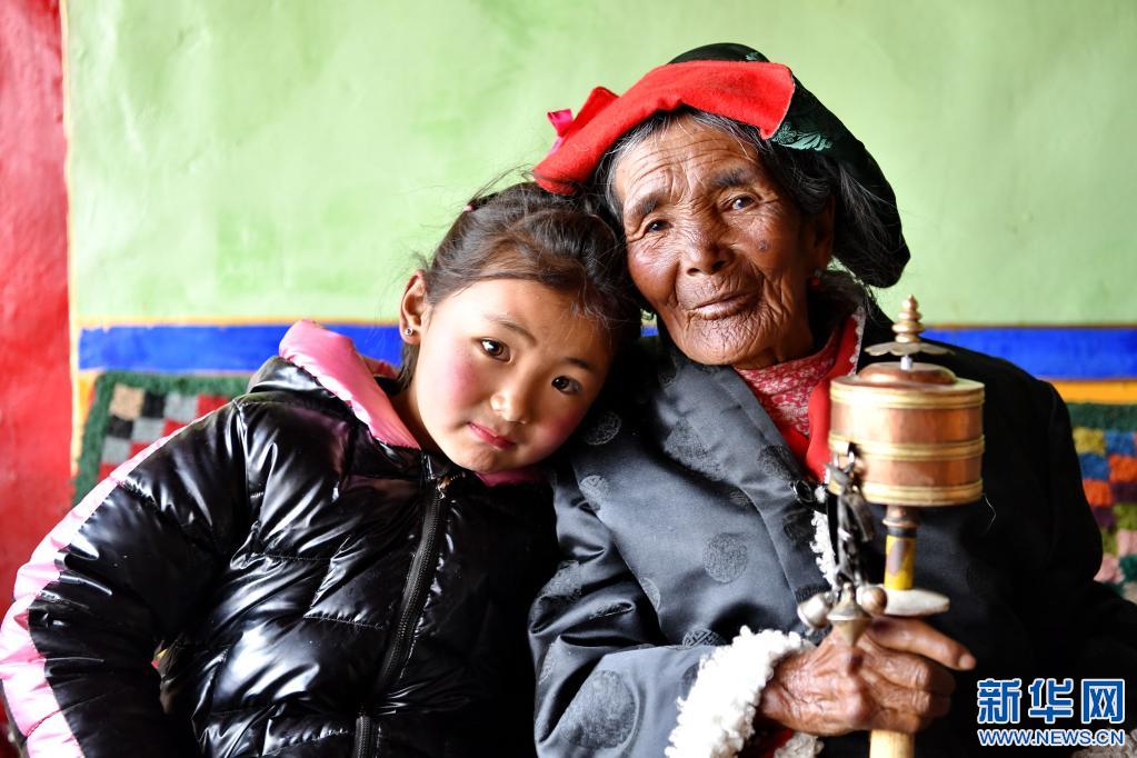 拉確老人(右)和重外孫女白瑪央拉在一起(4月16日攝)。新華社記者 張汝鋒 攝