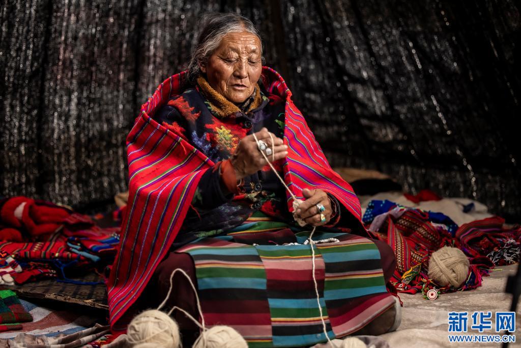 才旦拉姆老人在家里編織氆氌(4月27日攝)。新華社 貢覺(jué)群培 攝