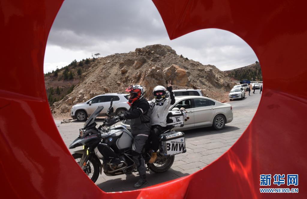 在西藏芒康縣拉烏山,一對(duì)騎行摩托的年輕人準(zhǔn)備出發(fā)(5月2日攝)。新華社記者 陳?ài)?攝