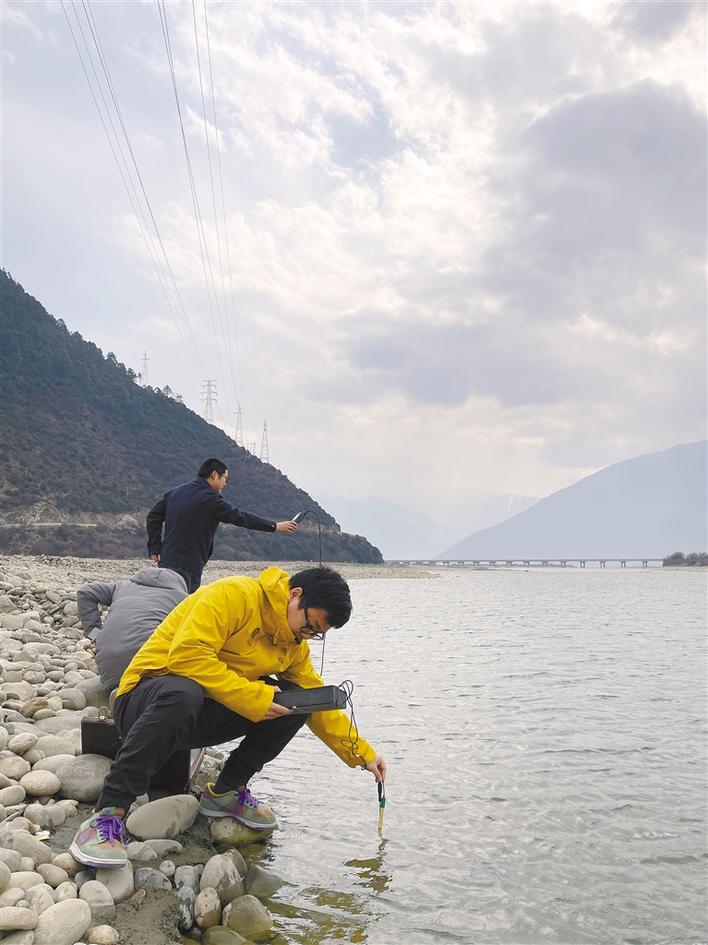 監(jiān)測組人員在川藏鐵路附近重要水體開展現(xiàn)場監(jiān)測。
