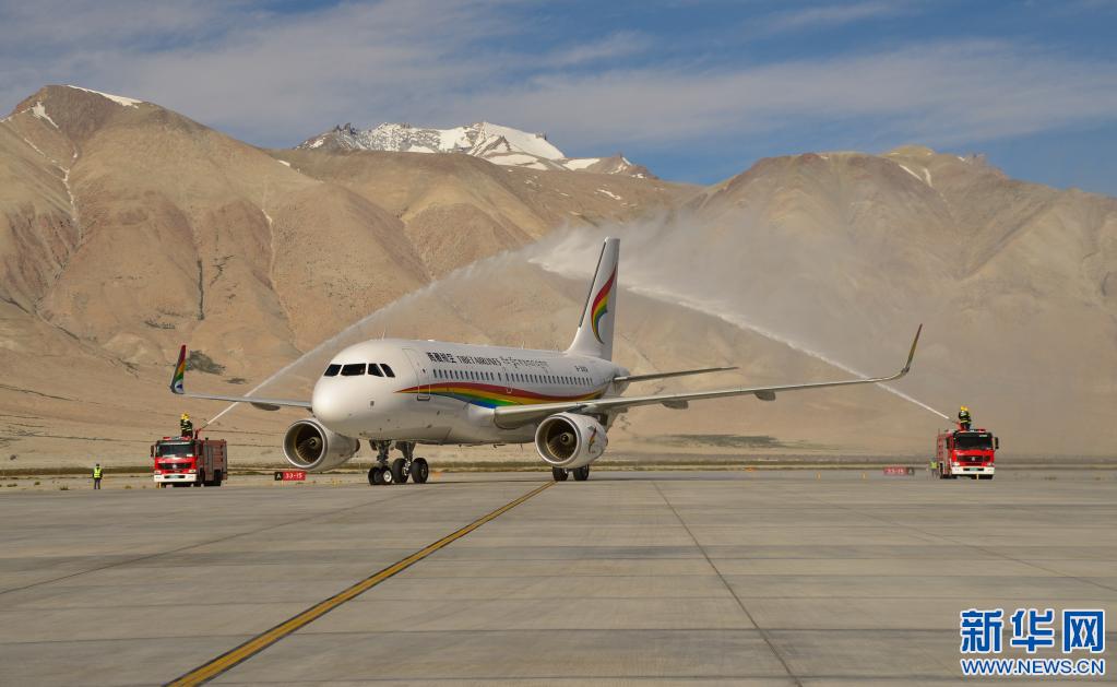 2020年7月1日,阿里昆莎機場通航10周年,飛機穿過水門。新華社記者田金文 攝