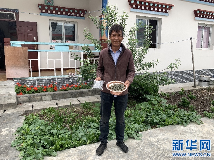 尼瑪頓珠展示他們家今年炒的茶葉(5月12日攝)。新華網(wǎng) 雪珍 攝
