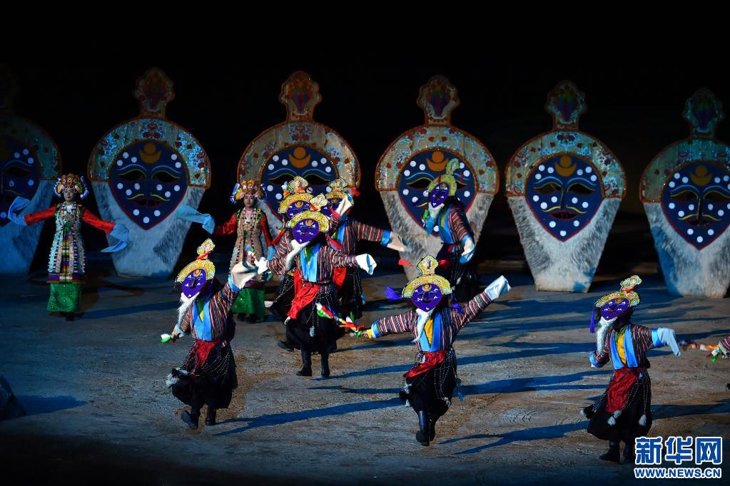 大型實(shí)景劇《文成公主》演職人員共計(jì)800余名,除專(zhuān)職演員外,很多當(dāng)?shù)夭刈遛r(nóng)牧民參與演出,有效促進(jìn)了當(dāng)?shù)厝罕娋蜆I(yè)增收。圖為演員在劇中表演藏戲(2019年10月31日攝)。新華社記者 李鑫 攝