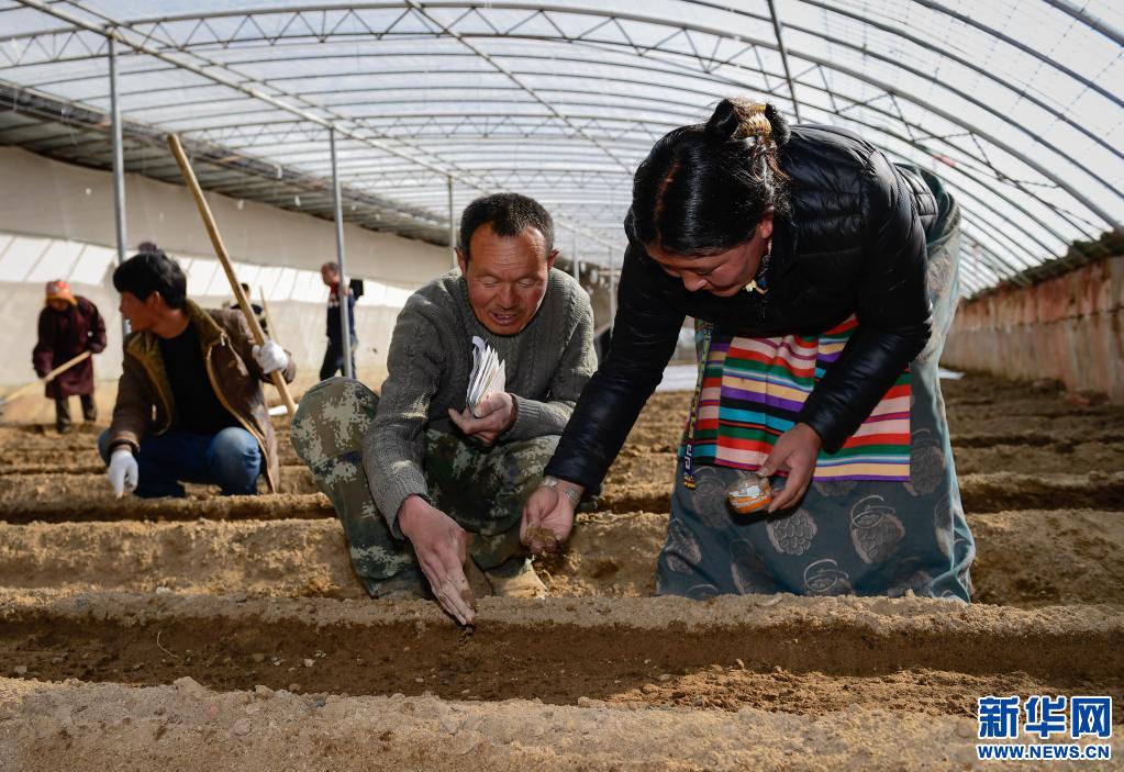 2018年3月13日,西藏阿里地區(qū)噶爾縣生態(tài)農(nóng)業(yè)產(chǎn)業(yè)園農(nóng)技人員楊茂錄(右二)在園區(qū)大棚中為當(dāng)?shù)刎毨?hù)石確桑嘎(右)傳授瓜果種植技術(shù)。新華社記者 劉東君 攝