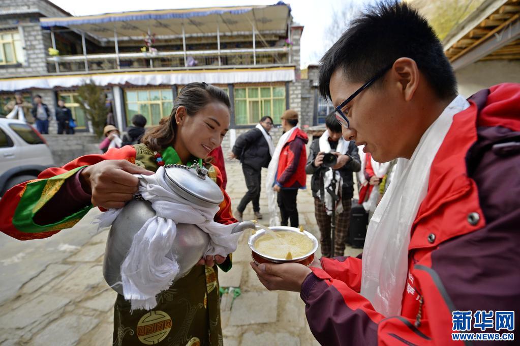 2016年11月15日,在拉薩市城關(guān)區(qū)奪底鄉(xiāng)維巴村,身著盛裝的藏族姑娘德吉為剛抵達(dá)她家的游客斟滿(mǎn)青稞酒。德吉是特色民宿“洛奔曲闊拉薩人家”的主人。新華社記者 劉東君 攝