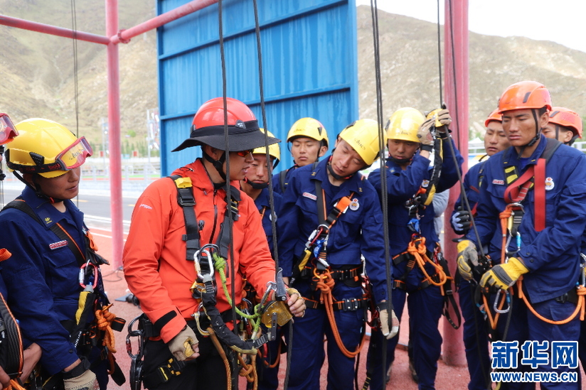 隊(duì)員正在進(jìn)行繩索救援訓(xùn)練(6月6日攝)。(新華網(wǎng)發(fā) 劉論剛攝)