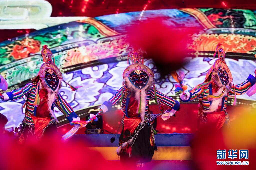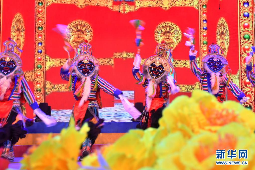 6月12日,在西藏拉薩市的自治區(qū)群藝館,演員表演藏戲《吉祥歡歌》。新華社記者 孫瑞博 攝