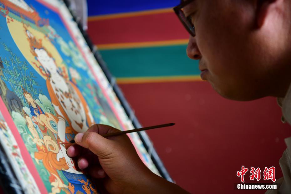 6月12日,2021年“文化和自然遺產(chǎn)日”西藏非遺展演展示系列活動(dòng)在拉薩舉行?;顒?dòng)現(xiàn)場(chǎng)融入了文藝演出、非遺展演、非遺產(chǎn)品展銷等內(nèi)容,市民游客可親身體驗(yàn)非遺產(chǎn)品的制作過(guò)程。圖為非遺傳承人在手繪唐卡?!?中新社記者 貢嘎來(lái)松 攝