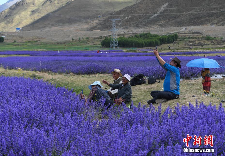 6月25日,位于西藏自治區(qū)拉薩市達(dá)孜區(qū)新倉村貝拉莊園的100畝薰衣草花海競相綻放,吸引不少游客和當(dāng)?shù)厥忻袂皝碛瓮?、拍照。中新社記?貢嘎來松 攝
