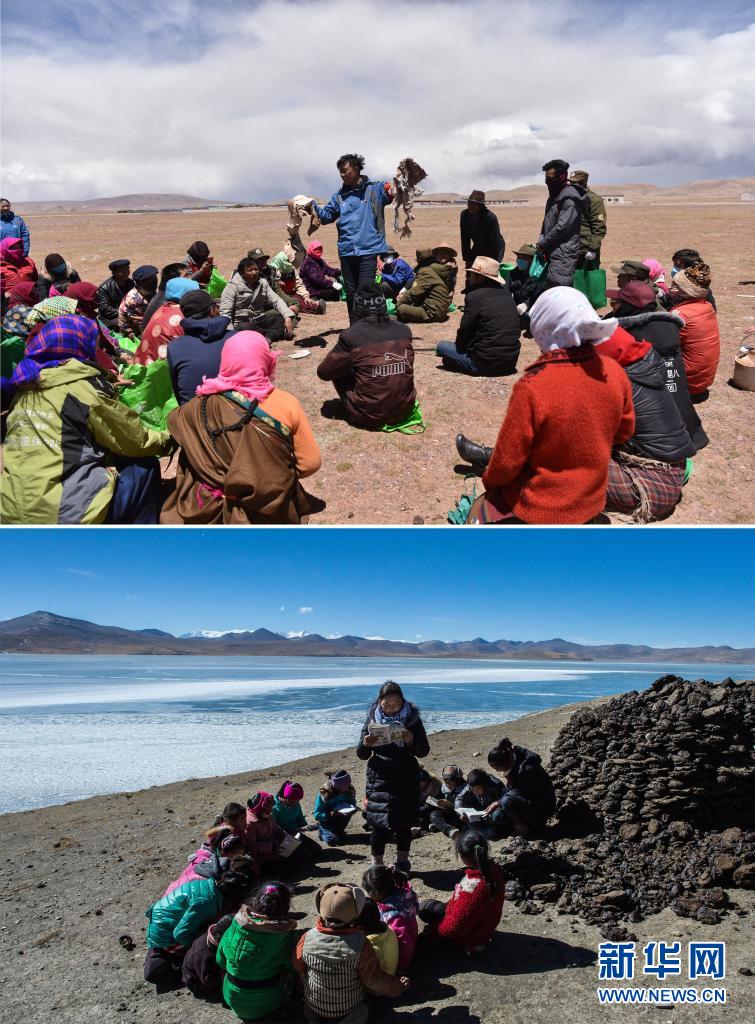 這是一張拼版照片:上圖為瑪曲鄉(xiāng)黨委書記朗卡江村(中)向參加活動(dòng)的村民講解如何區(qū)分可回收垃圾與不可回收垃圾(2019年5月28日攝,新華社記者周錦帥攝);下圖為在海拔約5000米的西藏山南市浪卡子縣堆瓦村,駐村工作隊(duì)員貢曲(中)和次仁倉決(右一)給放假的孩子補(bǔ)習(xí)功課(2017年2月9日攝,新華社記者普布扎西攝)。新華社發(fā)