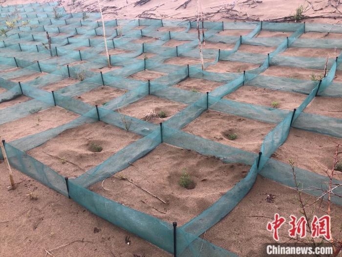“傳統(tǒng)的方法是用廢樹枝等擺成方格等一定的形狀壓沙,里面再種上植物,效果很好但樹枝往往四五年就腐爛了;最近我們?cè)趪L試推廣一種新型化學(xué)材料方格,成規(guī)???,且能維持七到十年?!敝袊?guó)科學(xué)院西北生態(tài)資源研究院研究員常學(xué)向?qū)τ浾哒f。