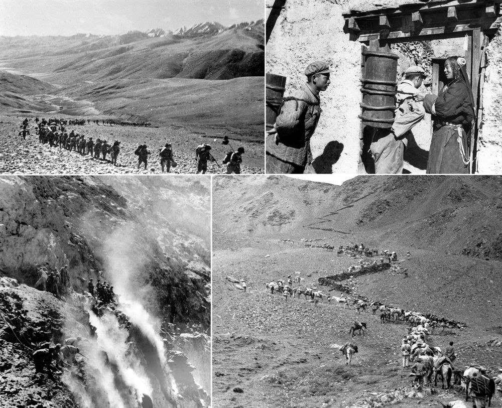 左上圖為1950年,人民解放軍戰(zhàn)士跋涉在高山峻嶺間向西藏前進(jìn)(資料照片);右上圖為人民解放軍戰(zhàn)士在執(zhí)勤空隙為藏族老百姓背水(資料照片,張正模攝);左下圖為筑路戰(zhàn)士在懸崖絕壁上修建川藏公路(資料照片);右下圖為1951年7月,解放軍第十八軍進(jìn)藏先遣部隊行進(jìn)在瓦合山上(新華社記者袁克忠攝)。