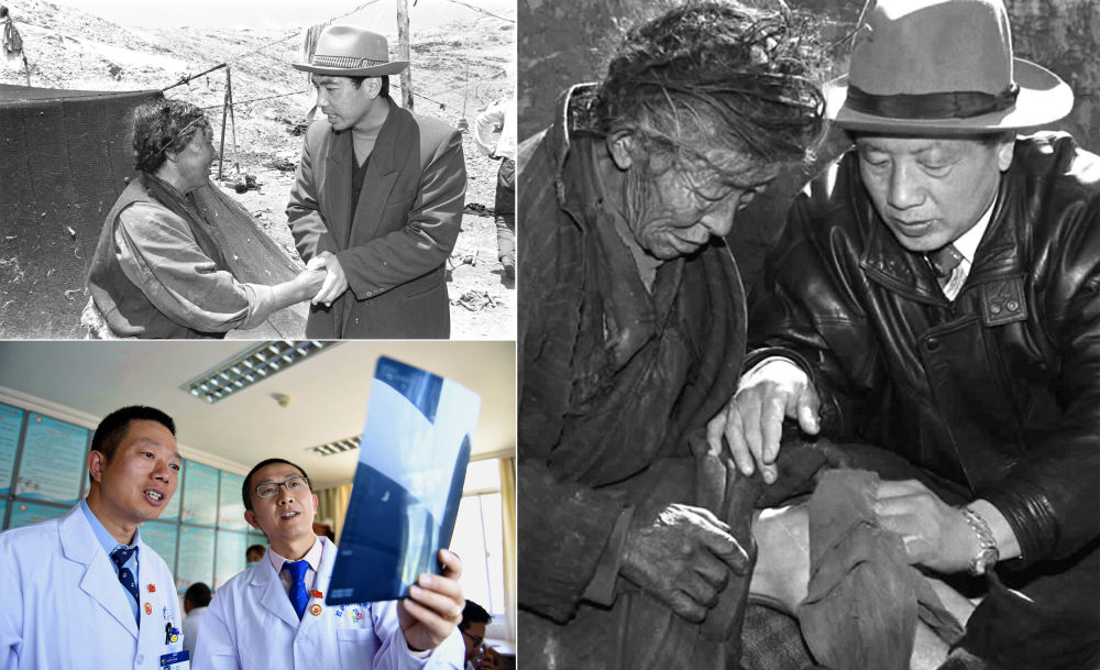 左上圖為來自陜西的援藏干部、阿里日土縣副縣長賈冗勇深入牧區(qū),幫助藏族牧民解決生產(chǎn)、生活的實際困難(新華社記者土登攝,1997年11月11日發(fā));左下圖為2017年8月3日,北京積水潭醫(yī)院援藏醫(yī)生龔曉峰(右)和北京天壇醫(yī)院援藏醫(yī)生李家謀在拉薩市人民醫(yī)院骨科病房內(nèi)查看患者的X光片,進(jìn)行工作交接(新華社記者晉美多吉攝);右圖為孔繁森(右)在阿里日土縣過巴鄉(xiāng)為孤寡老人益西卓瑪治病(新華社記者土登攝,1994年12月26日發(fā))。