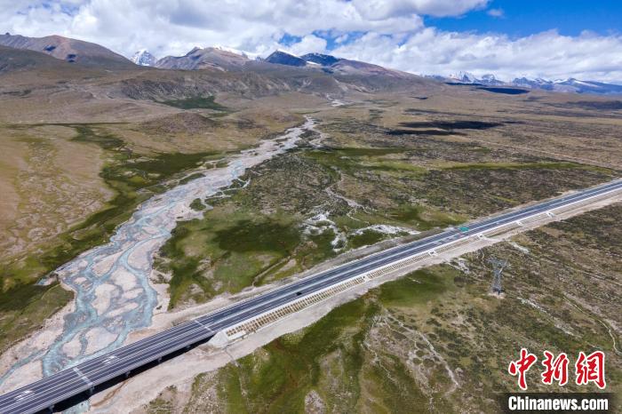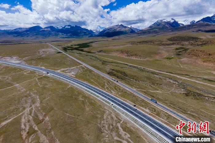 那拉高速(畫面下方)、青藏公路和遠處的雪山。 江飛波 攝