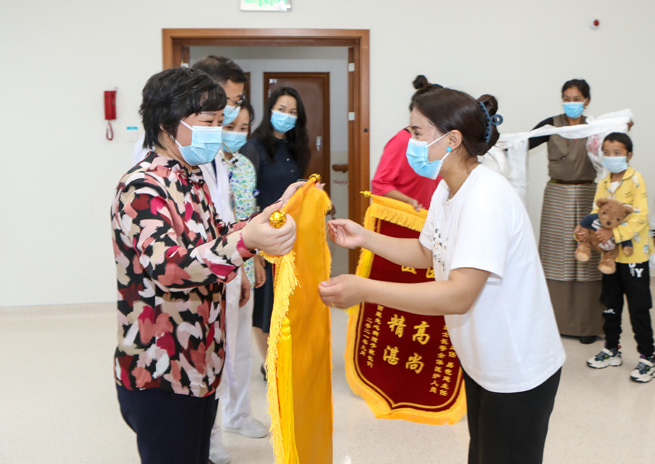 鄧?yán)蚋敝魅我恍锌赐藖?lái)渝治療的15位患兒,并為他們送上嶄新的書包和文具。并與患兒家長(zhǎng)熱情交談,詳細(xì)了解患兒恢復(fù)情況?;純杭覍俅碜楷敽屯贩謩e向重慶市衛(wèi)健委和重醫(yī)附屬兒童醫(yī)院贈(zèng)送了錦旗,并獻(xiàn)上了潔白的哈達(dá)表示感謝。