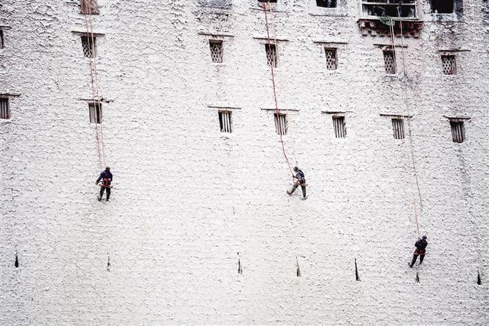 據(jù)悉,工作人員要先對涂料進行過濾,然后再進行噴灑。而人力無法抵達的地方則由專業(yè)人員化身“蜘蛛人”用涂料噴槍進行粉刷。在高空作業(yè)的“蜘蛛人”是經(jīng)過培訓(xùn)的特定人員,“蜘蛛人”懸掉在空中,并有專人負責(zé)拉繩,大家齊心協(xié)力完成粉刷工作。
