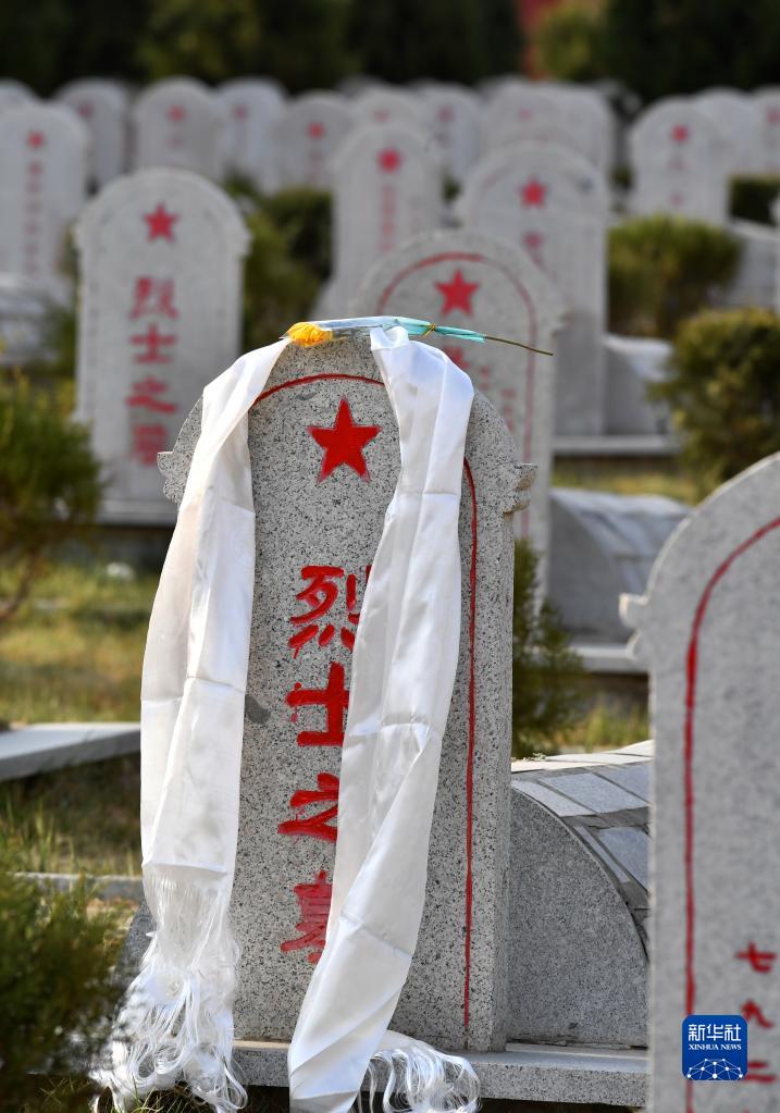 在西藏拉薩烈士陵園,一條潔白的哈達掛在烈士墓碑上(4月4日攝)。新華社記者 覺果 攝