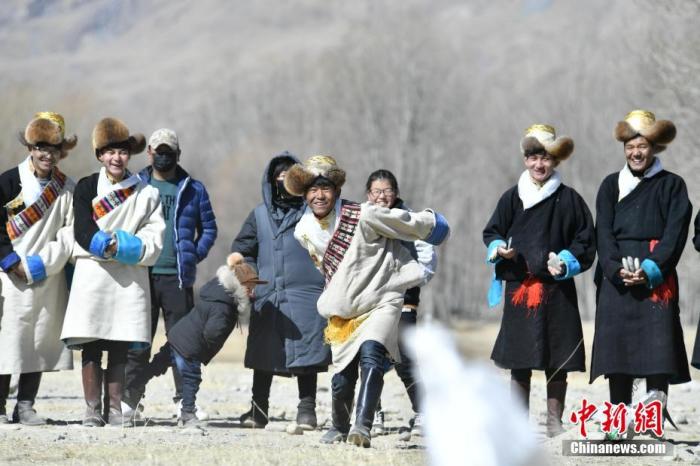 資料圖為西藏拉薩市曲水縣民眾新年期間表演藏族民間娛樂項(xiàng)目“打牛角”。中新社記者 貢嘎來松 攝