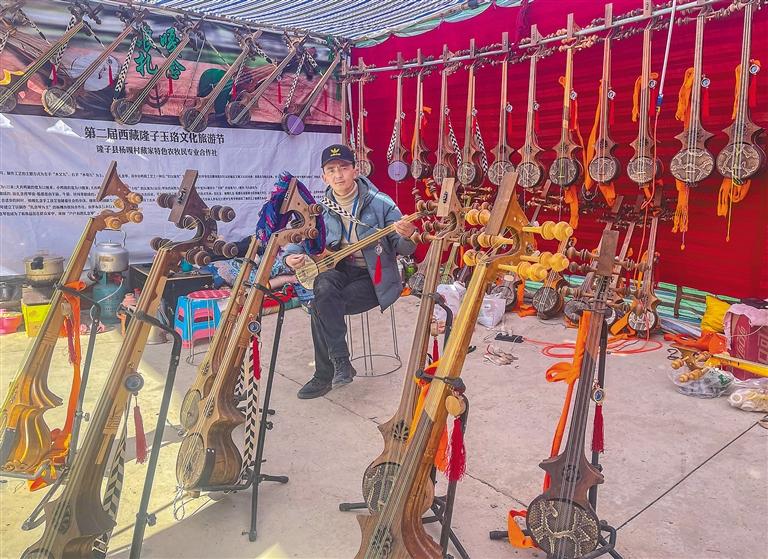 圖為銷售民族樂器的商戶正在為消費者現(xiàn)場彈奏“扎念”。