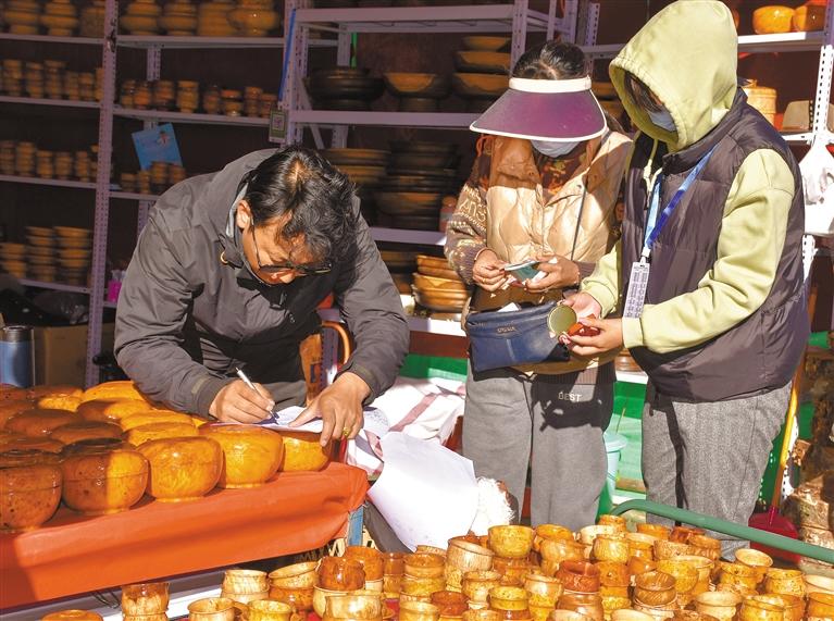 山南本地的特色優(yōu)質商品尤其受到青睞:扎囊的氆氌,洛扎的粉絲,瓊結的蕎麥面,加查的核桃、木碗,貢嘎的邦典、紅土豆,措美的奶渣、牛羊肉等等,紛紛占據重要展位,引來消費者紛至沓來,熱情選購。