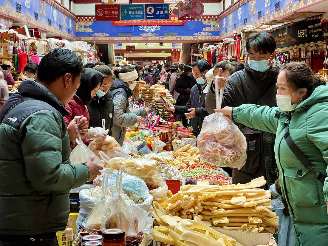 沖賽康市場(chǎng)、八廓商城、拉薩市區(qū)各大小超市熱鬧非凡、人頭攢動(dòng),處處都是為了采購(gòu)藏歷新年年貨樂此不疲的居民群眾,耳邊盡是熟悉的吆喝聲,到處都是歡樂與喜慶。