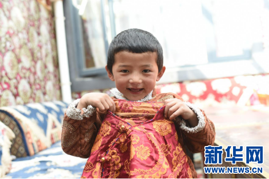 2月27日,在榮瑪鄉(xiāng)高海拔生態(tài)搬遷點藏曲村今年5歲的晉美塔杰展示新年的衣服。新華網 旦增努布 攝