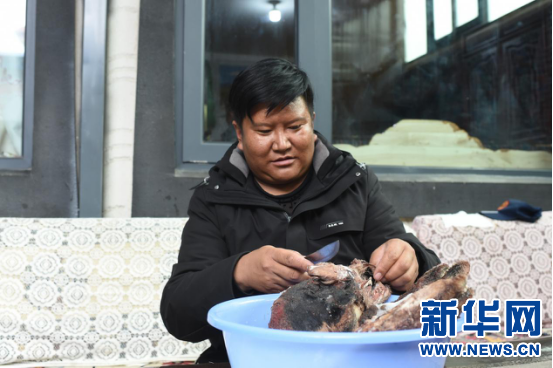 2月27日,在榮瑪鄉(xiāng)高海拔生態(tài)搬遷點村民達娃次仁在清洗羊頭。新華網 旦增努布 攝