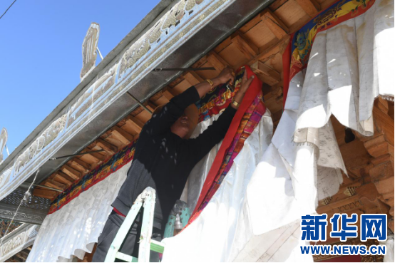 3月2日,乃東區(qū)郭沙村村民巴桑在更換大門的香布(一種藏式裝飾)。新華網 旦增努布 攝