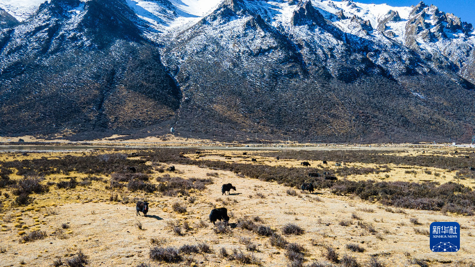 西藏娘亞牦牛養(yǎng)殖產(chǎn)業(yè)發(fā)展有限責(zé)任公司的牦牛在牧場(chǎng)上活動(dòng)(3月30日攝,無(wú)人機(jī)照片)。新華社記者 周荻瀟 攝