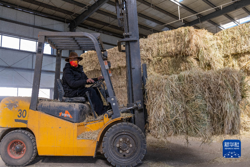 貢培在西藏娘亞牦牛養(yǎng)殖產(chǎn)業(yè)發(fā)展有限責(zé)任公司的飼草料倉(cāng)庫(kù)工作(3月30日攝)。新華社記者 周荻瀟 攝