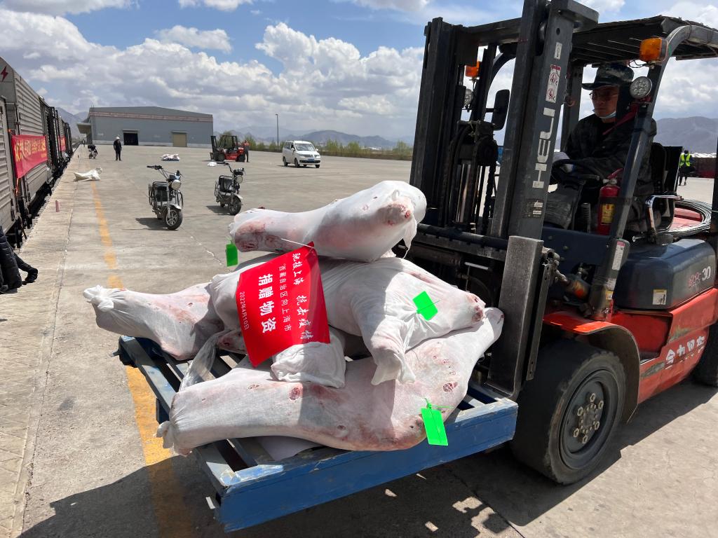 4月10日,鐵路工作人員在西藏日喀則站裝運(yùn)牦牛肉。(中國(guó)鐵路青藏集團(tuán)有限公司拉薩車務(wù)段供圖)