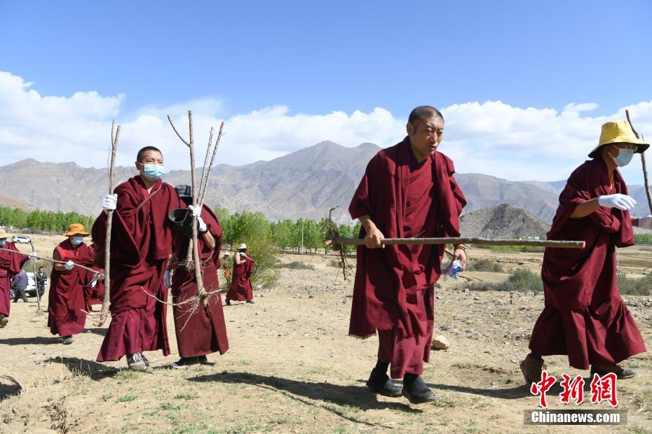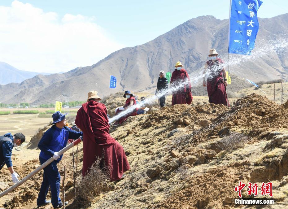 4月15日,西藏大昭寺僧人等在蔡公堂鄉(xiāng)植樹。當(dāng)日,西藏大昭寺在拉薩市城關(guān)區(qū)蔡公堂鄉(xiāng)啟動拉薩南北山2800余畝山地綠化工程項目。 中新社記者 貢嘎來松 攝