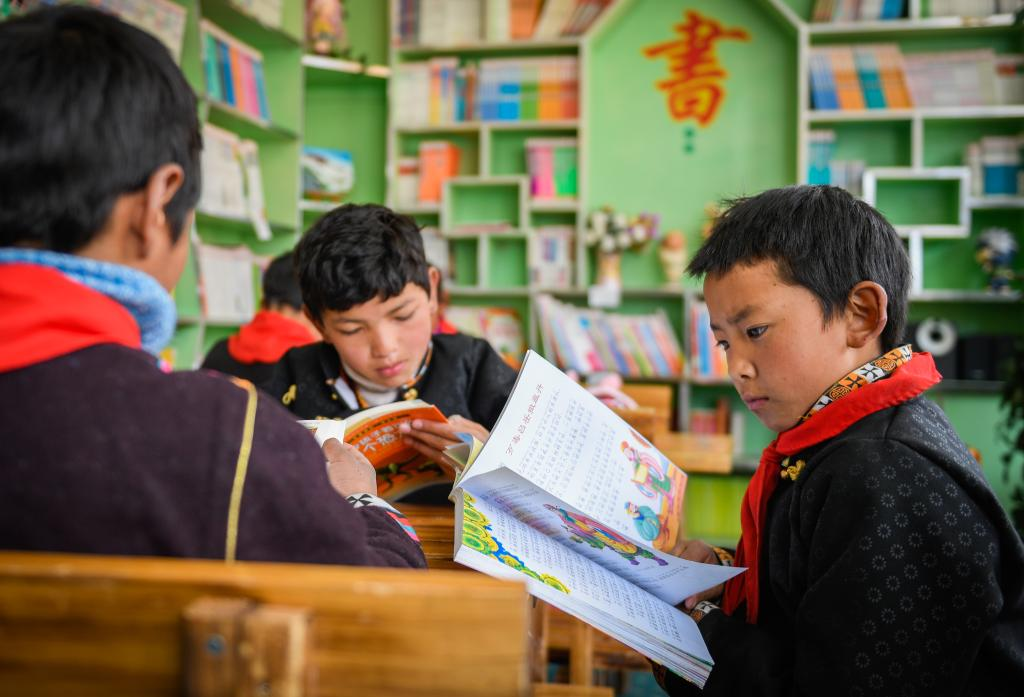 西藏林芝市工布江達(dá)縣仲莎鄉(xiāng)中心小學(xué)低年級(jí)學(xué)生在校圖書(shū)室內(nèi)閱覽書(shū)籍(2018年4月攝)。新華社發(fā)