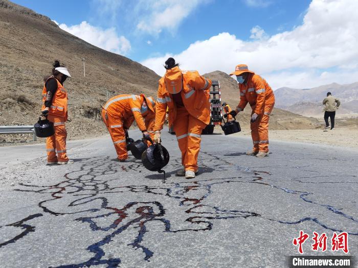 圖為在基層農(nóng)村公路,女護(hù)路員正熟練地開展瀝青灌縫作業(yè)。西藏自治區(qū)交通運(yùn)輸廳供圖