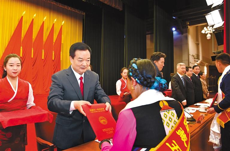 4月29日上午,西藏自治區(qū)慶?!拔逡弧眹?guó)際勞動(dòng)節(jié)暨表彰大會(huì)在拉薩舉行。自治區(qū)黨委書記王君正出席會(huì)議并講話。這是王君正為受表彰代表頒獎(jiǎng)。記者 旦增西旦 攝