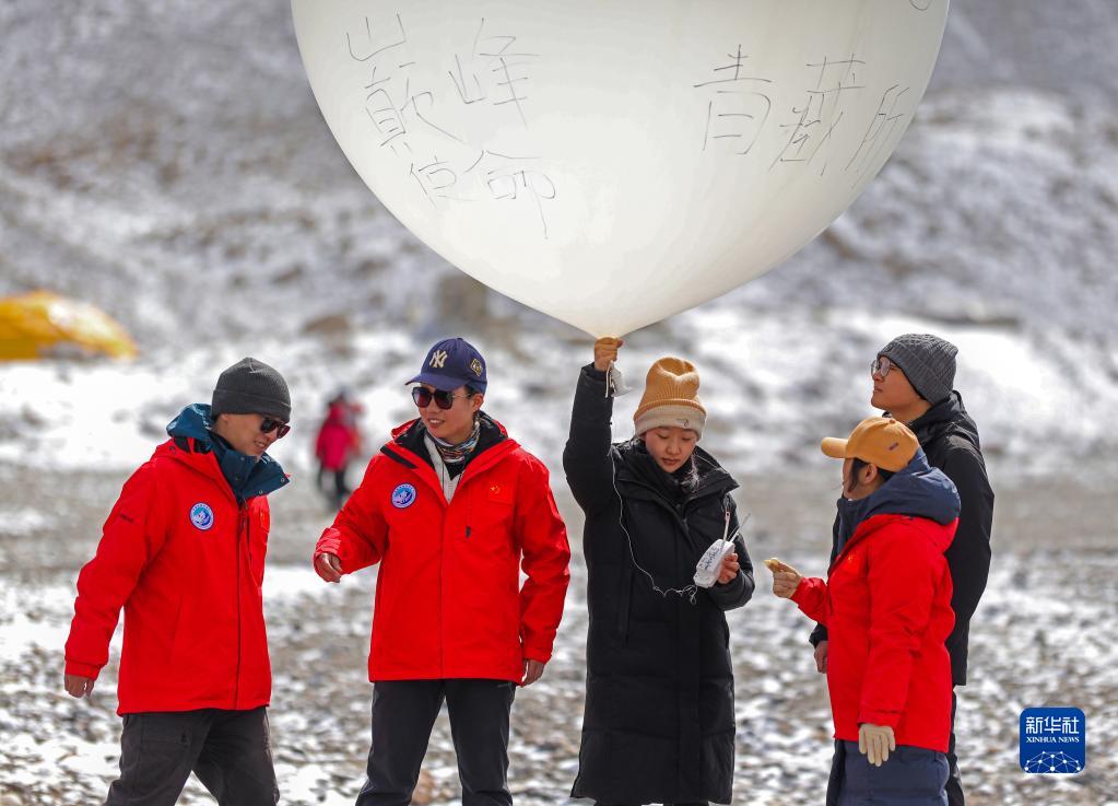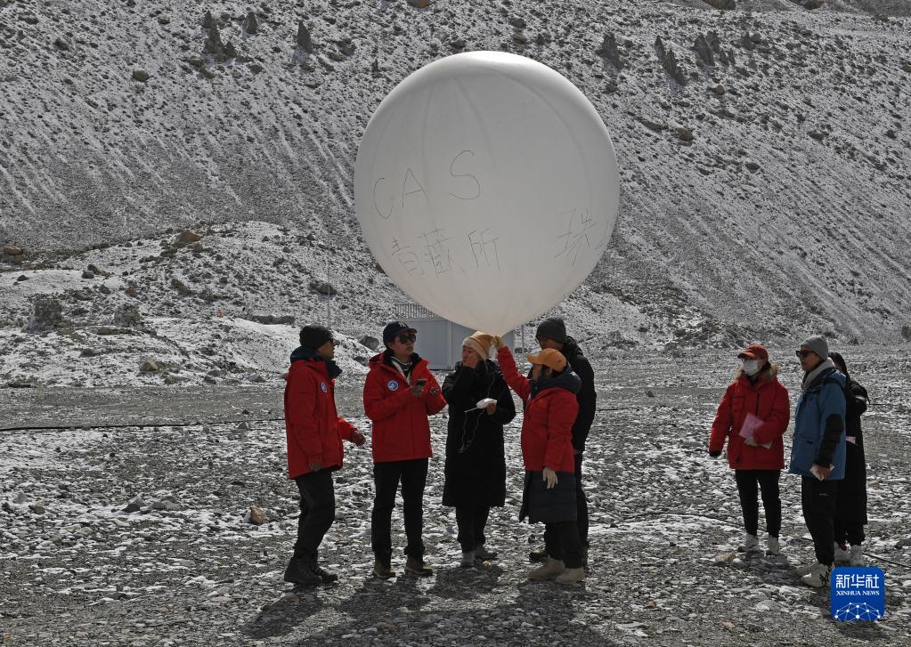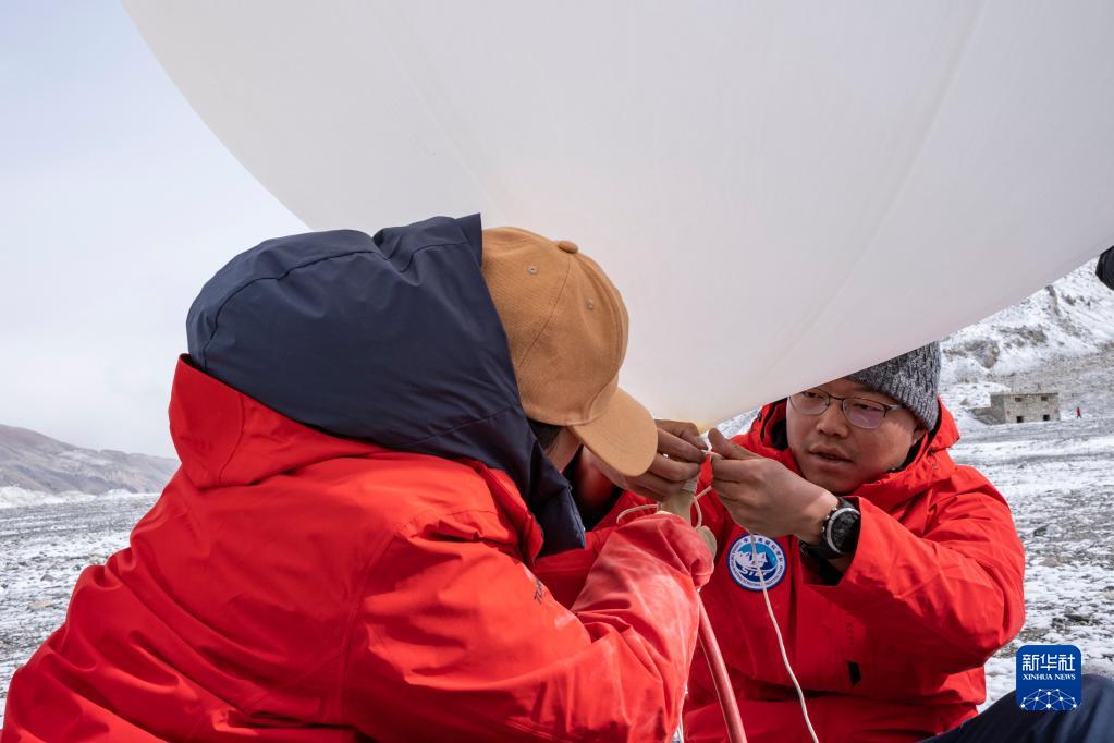 在珠峰登山大本營,科研人員放飛無線電探空氣球(4月30日攝)。新華社記者 姜帆 攝
