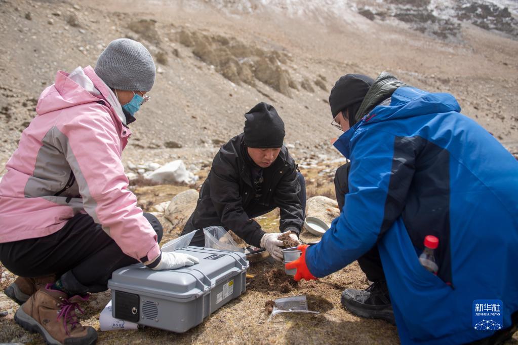 科研人員在珠峰地區(qū)采集土樣(4月30日攝)。新華社記者 旦增尼瑪曲珠 攝