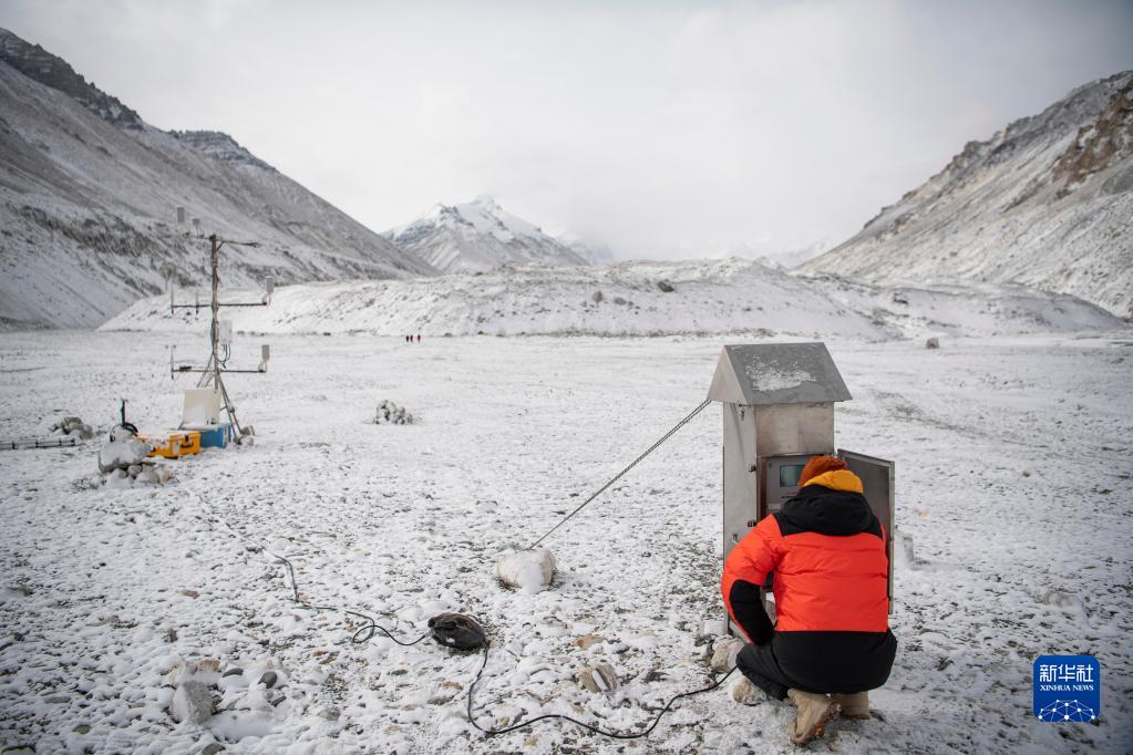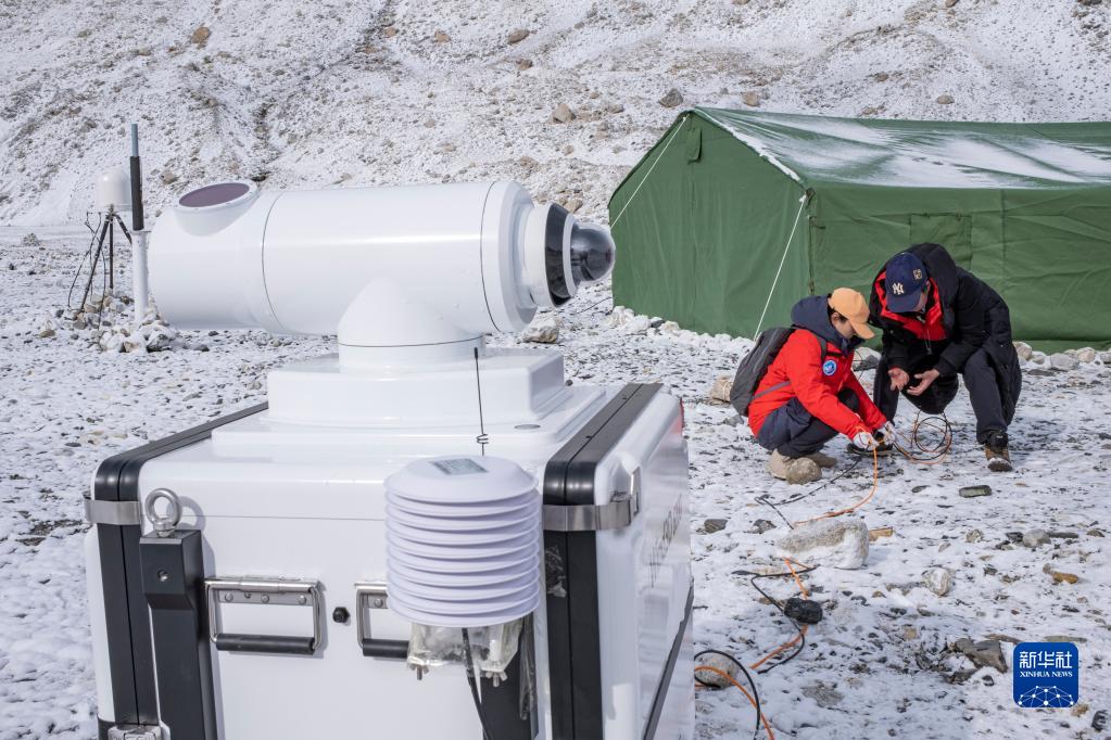 在珠峰登山大本營,科研人員給激光測風雷達布線(4月30日攝)。新華社記者 孫非 攝