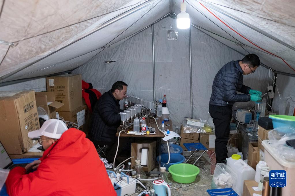 在珠峰登山大本營,科研人員提取冰川融水里的微生物(4月30日攝)。新華社記者 孫非 攝