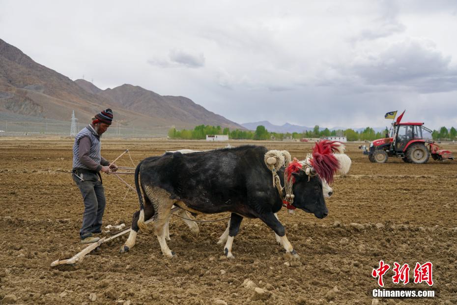 5月2日,西藏日喀則田間,“二牛抬杠”和拖拉機(jī)耕地同時(shí)進(jìn)行。 江飛波 攝