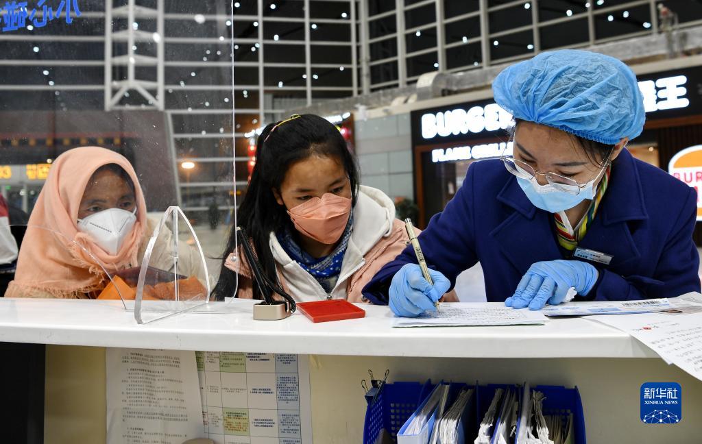 5月8日,在拉薩貢嘎機(jī)場候機(jī)樓,機(jī)場服務(wù)人員(右)為患兒和家人登記信息。新華社記者 張汝鋒 攝