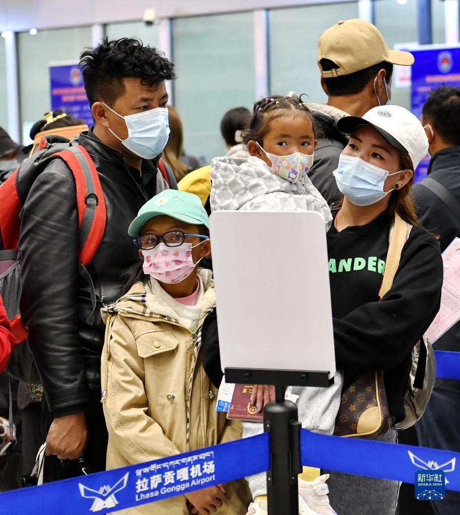 5月8日,在拉薩貢嘎機(jī)場,家長帶著患兒準(zhǔn)備安檢登機(jī)。新華社記者 張汝鋒 攝