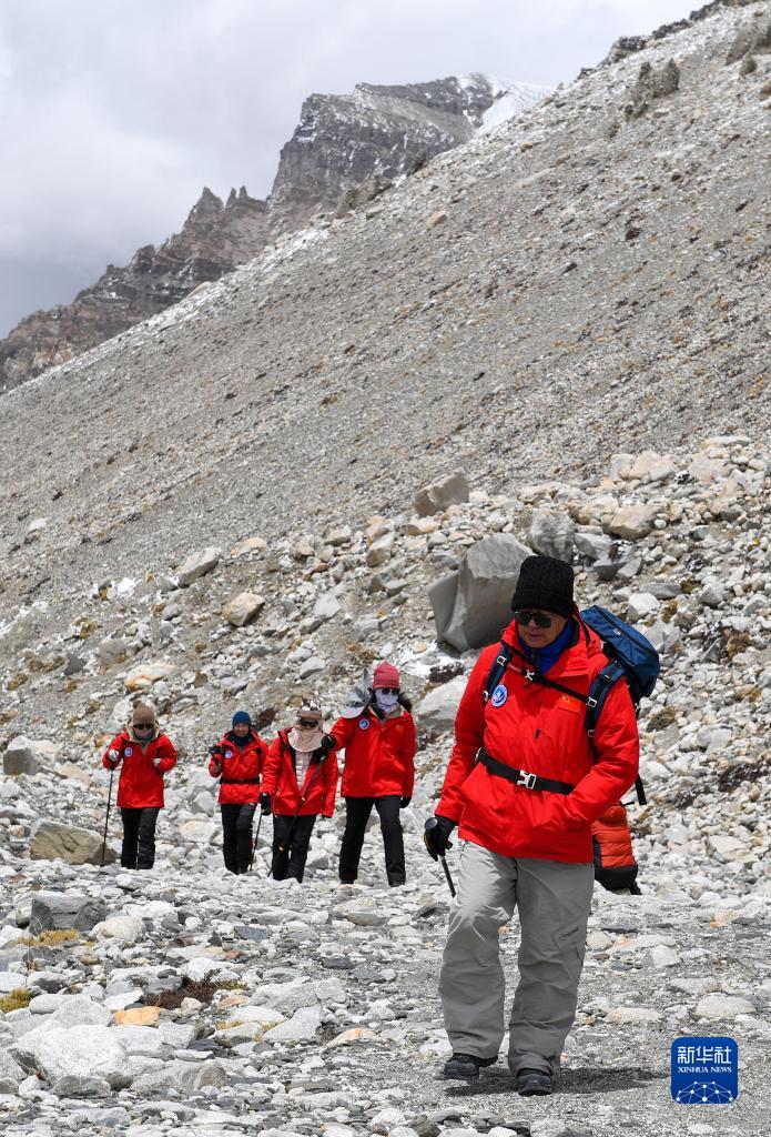 中國科學(xué)院院士、北京大學(xué)環(huán)境科學(xué)與工程學(xué)院院長朱彤(右一)和科研人員在珠峰登山大本營和絨布冰川間徒步穿梭(5月1日攝)。新華社記者 姜帆 攝
