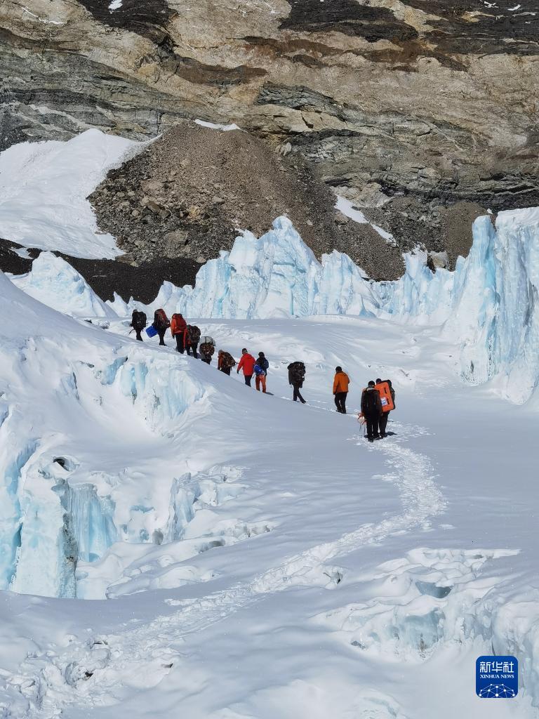 冰雪與污染物考察分隊(duì)在東絨布冰川區(qū)域進(jìn)行科學(xué)考察(5月7日攝)。新華社發(fā)(康世昌 攝)