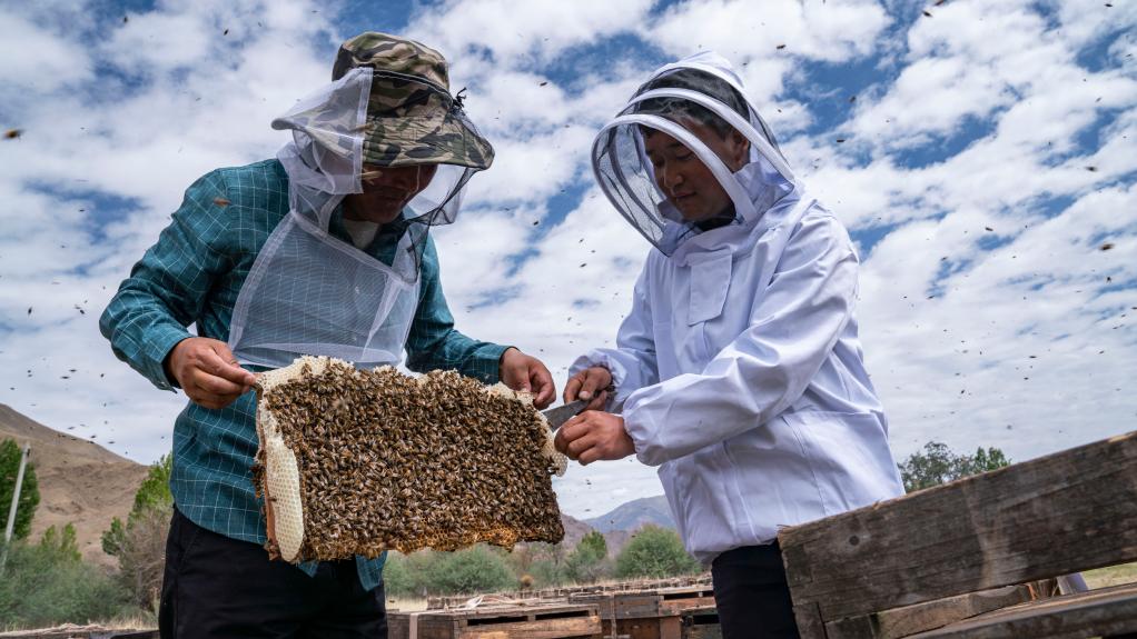 夜伴蜂聲有限公司的技術(shù)員(右)正在教授山南市錯那縣覺拉鄉(xiāng)村民普巴占堆蜜蜂養(yǎng)殖技術(shù)。新華社記者 孫非 攝