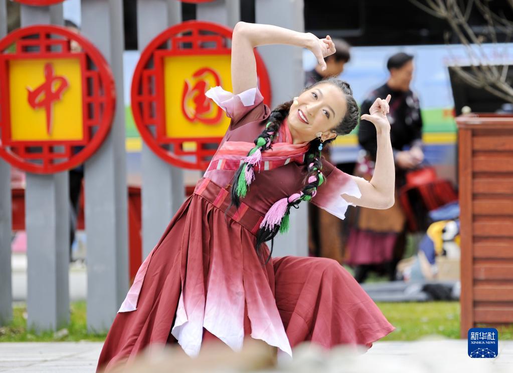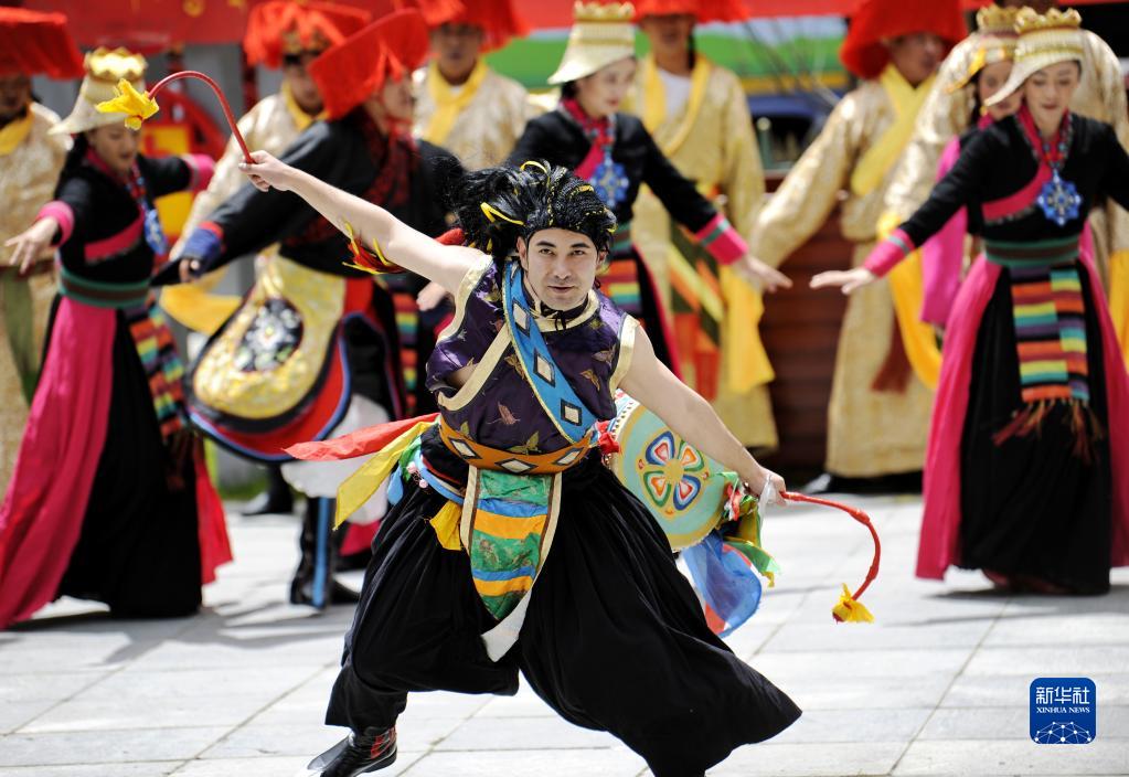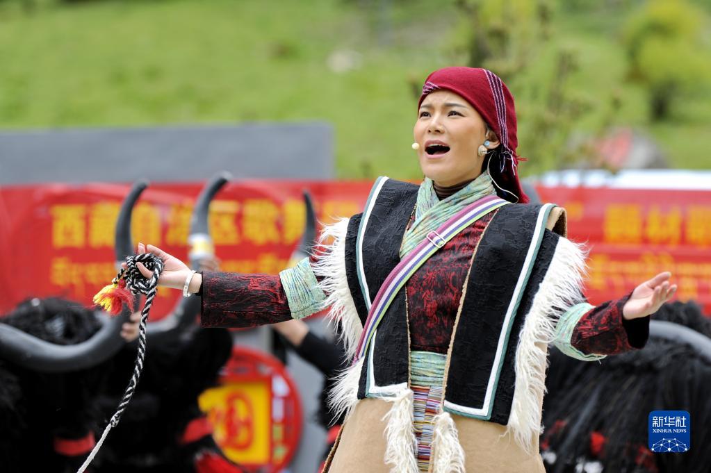 5月31日,演員在隆子縣玉麥鄉(xiāng)文化廣場(chǎng)表演歌舞劇《天邊格?;ā?。新華社記者 劉洲鵬 攝