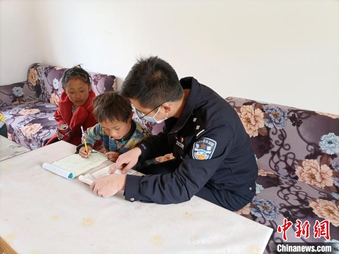 圖為民警為扎西江措(左二)輔導(dǎo)作業(yè)。旺旦次仁 攝