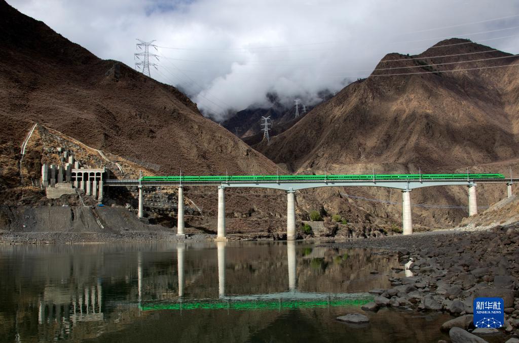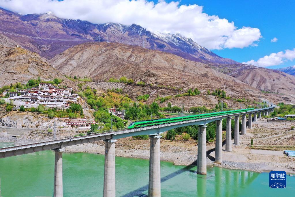 4月14日,復(fù)興號列車行駛在西藏朗縣境內(nèi)的雅魯藏布江上。新華社記者 覺果 攝