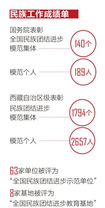 在西藏,民族團結家庭并不是個例,有不少個人和集體也為民族團結進步事業(yè)作出了突出貢獻。目前,西藏全區(qū)榮獲國務院表彰全國民族團結進步模范集體140個、模范個人189人;西藏自治區(qū)級表彰民族團結進步模范集體1794個、模范個人2657人;63家單位被評為“全國民族團結進步示范單位”,8家基地被評為“全國民族團結進步教育基地”。拉薩、日喀則、昌都、阿里、林芝5個市地成功創(chuàng)成“全國民族團結進步示范地(市)”。